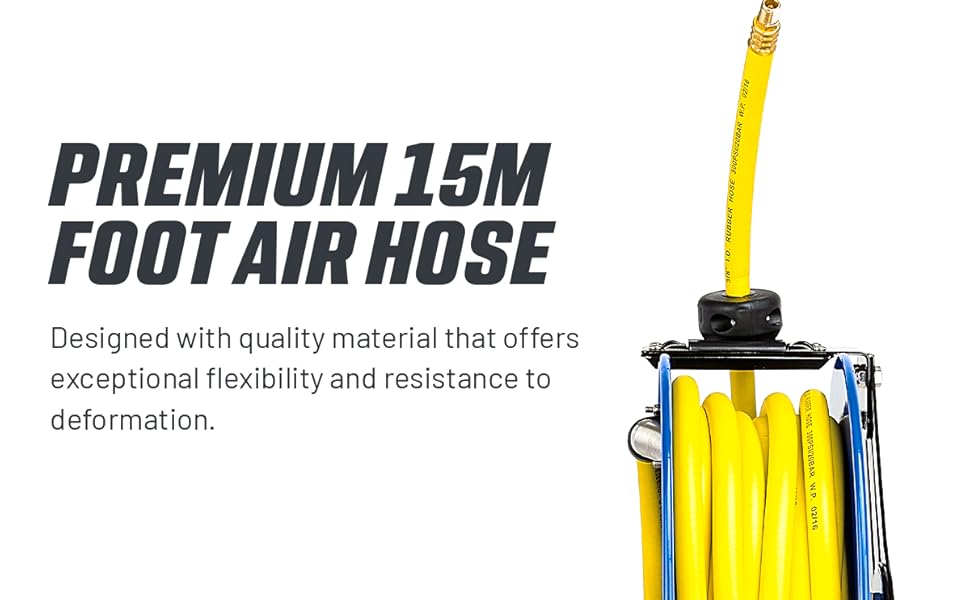 - REEL SPECS - This 9.5mm x 15m reel is constructed of heavy gauge Industrial steel; corrosion resistant powder coating; Premium Commercial SBR Rubber Hose working pressure is 300PSI/20BAR and 3/8" BSPT connections; (Lead-in hose not included).