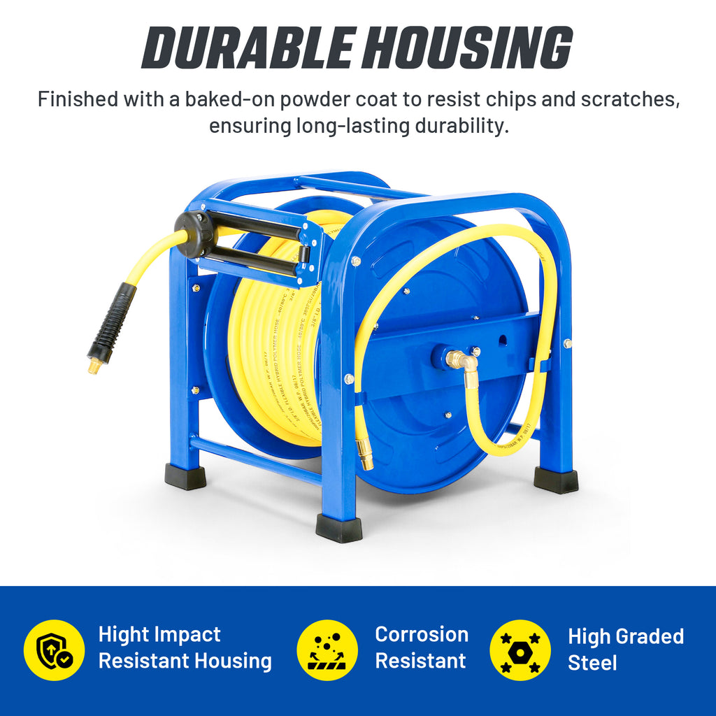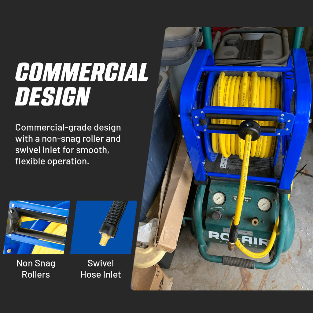 - SAFETY and PROPER USE - Our reels are best suited for indoor/outdoor use, night or day environments, for DIY or industrial applications, allowing extension to be properly stored, keeping the workplace safe; No bolts needed to mount, quad pod frame is portable and a 0.9cm (36”) lead-in hose included.
