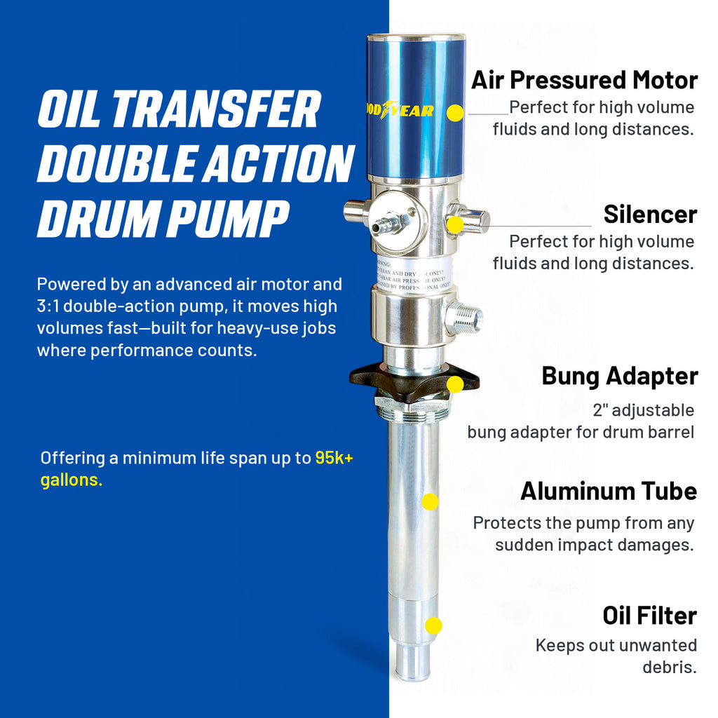 - EFFICIENT DESIGN and CAPABILITIES - Our Transfer Pumps are Double Action Self Priming designed, delivering the fast precise flow rates. This Smart design uses fewer parts for less pump wear tear, making it is easy to use maintain.This pump is best suited for a Multiple Fluid types of medium to high viscosity at a short to medium distance, typical fluids handled include: motor oil, synthetic oil hydraulic, gear oil, automatic transmission fluid suitable up to SAE 130 grade oil.